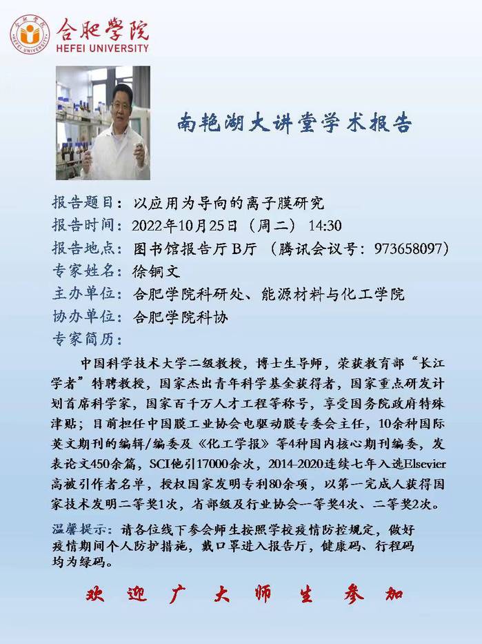 【讲座预告】以应用为导向的离子膜研究