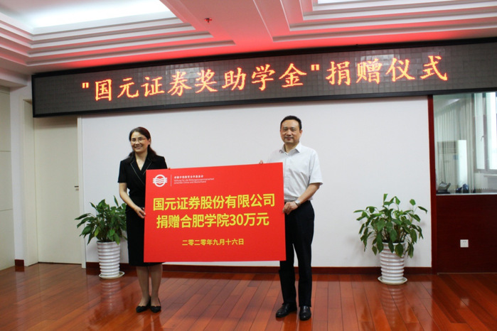 Am Nachmittag des 16. September veranstaltete die Universität Hefei die Spendenzeremonie für Guo Yuan Securities-Stipendien 2020. Jiang Ximin, stellvertretender Sekretär des Parteikomitees von Guoyuan Securities Co., Ltd, Chen Xiu, Vizepräsidentin der Universität Hefei und Vorsitzende des Stiftungsrats der Bildungskooperation zwischen China und Deutschland in Anhui(im Folgenden als Stiftung bezeichnet), He Shikun, Direktor der Finanzabteilung der Universität Hefei und Generalsekretär der Stiftung, Zhu Tao, Direktor der Abteilung für studentische Angelegenheiten und stellvertretender Direktor der Abteilung für Geschäftsentwicklung der Stiftung, Professor Chen Jianghua, Dekan der Fakultät für Wirtschaft und Management, und andere Mitarbeiter sowie Studentenvertreter der Stipendiaten aus dem Vorjahr nahmen an der Spendenzeremonie teil. Die Zeremonie wurde von Liu Jinping, Direktor der Verwaltungsabteilung der Stiftung, geleitet.