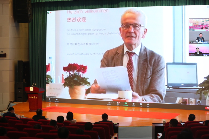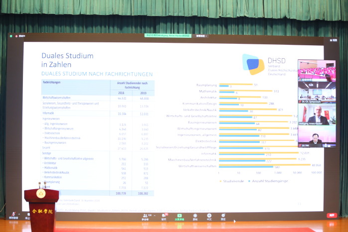 奥斯纳布吕克应用科学大学双元制教育学院院长沃尔夫冈·阿伦斯·费舍尔教授作题为《德国及奥斯纳布吕克应用科学大学双元制教育》的报告。他详细介绍了双元制高等教育的发展历史和现阶段的发展情况,他指出,双元制教育的特点是具有灵活性和应用性,这种学习模式能使学生们在学习理论知识的同时收获更多的实践经验。通过中德双方十年的不懈努力,双元制教育模式培养的学生数量不断增多,教学学科设计更加丰富,教育体系更加完善,尤其是工程学、电子技术、计算机等领域受到企业和学生们的广泛关注。