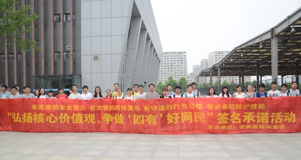 为响应第二届国家网络宣传周活动,6月9日,由安徽新媒体集团举办的“弘扬核心价值观,争做‘四有’好网民”十万人签名承诺接力活动在我校二区举办。活动由我校党委宣传部新闻中心举办,中安在线对此进行了采访报道。