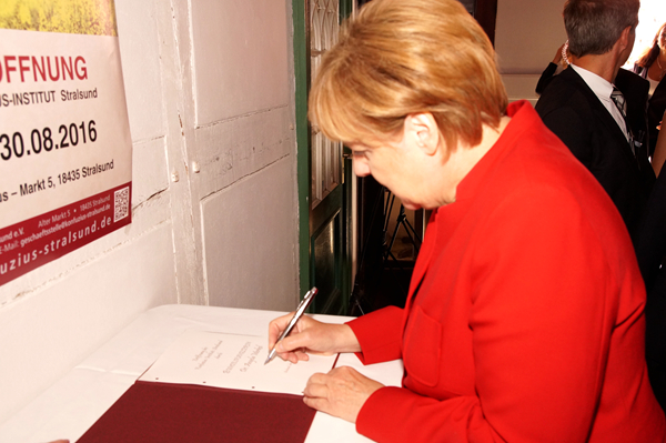 去年10月30日,中德两国总理共同访问了安徽合肥,在他们见证下我校与施特拉尔松德应用科学大学签署了共建孔子学院执行协议。揭牌前,默克尔首先在孔子学院签字薄上签名留念,并在中国驻德国大使史明德、国家汉办主任许琳等陪同下饶有兴趣地参观了去年其访问我校的图片展,更愉快地回忆起了当时的情形。校党委书记蔡敬民代表我校向默克尔展示并赠送了由去年她与李克强总理共同访问学校期间与师生合影制成的纪念品,默克尔欣然接受,并对我校在促进中德高校合作中所发挥的积极作用表示赞赏和欣慰。