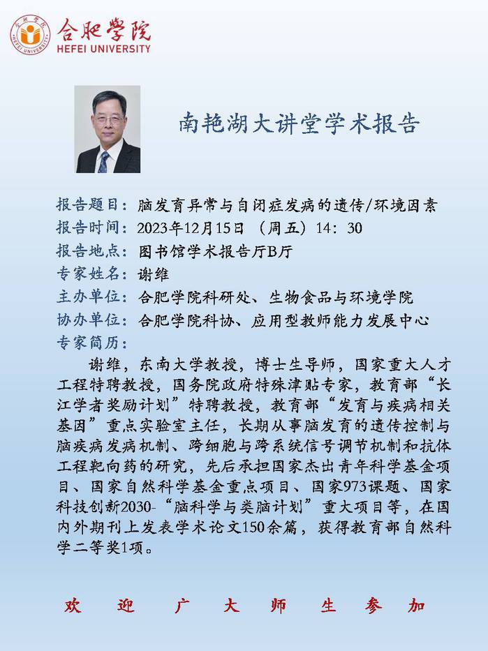 【南艳湖大讲堂】脑发育异常与自闭症发病的遗传/环境因素
